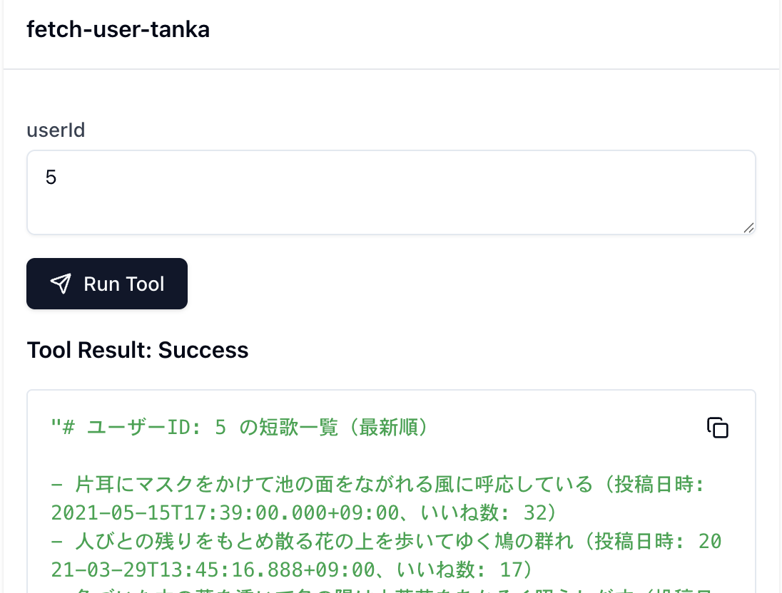 - ローカル環境で動作するMCPサーバーを構築し、ユーザーごとの短歌の一覧を取得するToolを作成する